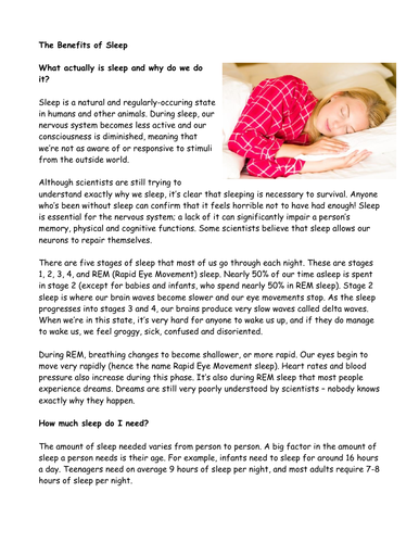The Importance Of Sleep Reading Comprehension Teaching Resources